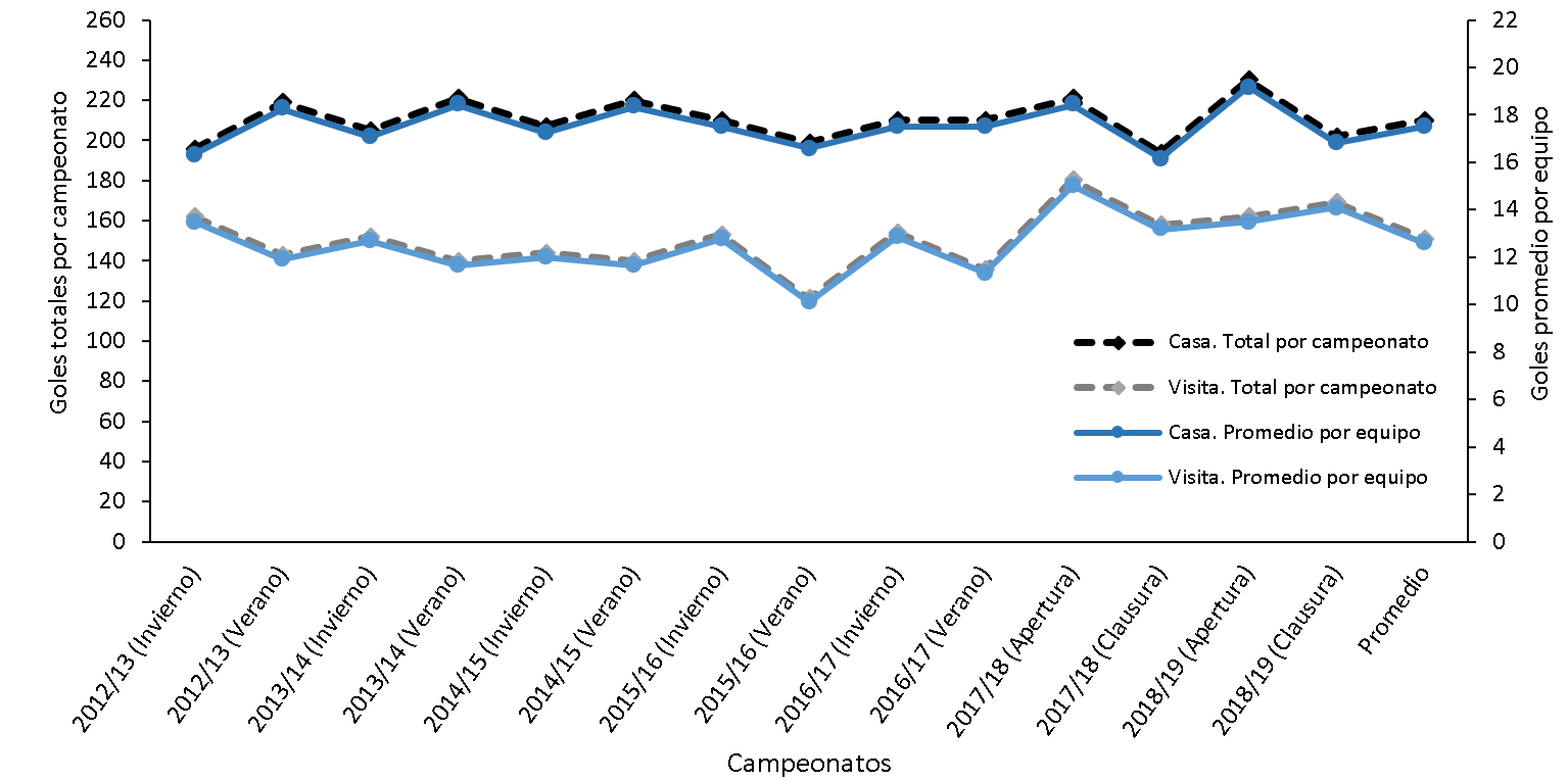 En la figura 2, se observa que la cantidad de goles anotados por los equipos cuando jugaban en casa fue mayor (210,28 ± 10,71) que cuando jugaban de visita (151,00 ± 15,06) (Z = -4,50; p < 0,01; R2 = 0,24). En promedio, un equipo anotó 17,52 ± 5,77 goles en casa y 12,58 ± 4,17 goles de visita (Z = -7,92; p < 0,01; R 2= 0,43) por campeonato. En general, los equipos locales anotaron un 28 % más goles que los equipos que jugaban de visitantes.