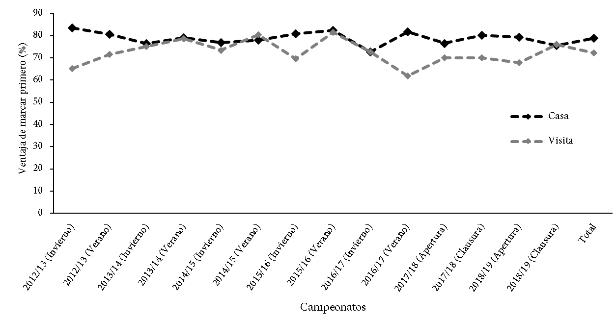 Conclusion: playing at home and scoring the first goal represented an advantage for teams to achieve positive results in the Costa Rican soccer championships analyzed.