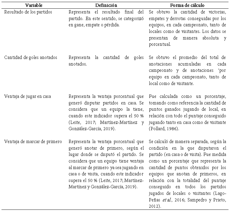 Considerando lo realizado en trabajos previos (Lago-Peñas et al., 2016; Leite, 2017; Martínez-Martínez y González-García, 2019; Sampedro y Prieto, 2012), se eligieron las siguientes variables para analizar: a) resultados de los partidos, b) cantidad de goles anotados, c) ventaja de jugar en casa y d) ventaja de marcar de primero. Estas se detallan en la tabla 1.