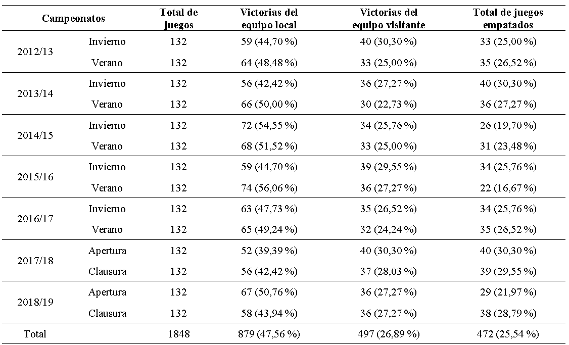 Se observa, en la tabla 2, la cantidad de victorias, derrotas y empates conseguidos por los equipos, en función del lugar donde se jugó el partido en cada uno de los 14 campeonatos analizados. Se registró mayor cantidad de victorias cuando los equipos jugaron en condición de locales en comparación a cuando jugaron de visitantes. La cantidad total de partidos ganados por los equipos cuando jugaban de locales fue de 62,78 ± 6,39, mientras que cuando estuvieron de visita fue de 35,50 ± 2,95 (Z = -4,51; p < 0,01; R2 = 0,22). En promedio, un equipo logró ganar 5,23 ± 2,25 de sus partidos en casa, mientras que cuando jugó de visita ganó tan solo 2,95 ± 1,79 (Z = -8,87; p < 0,01; R2 = 0,47).
