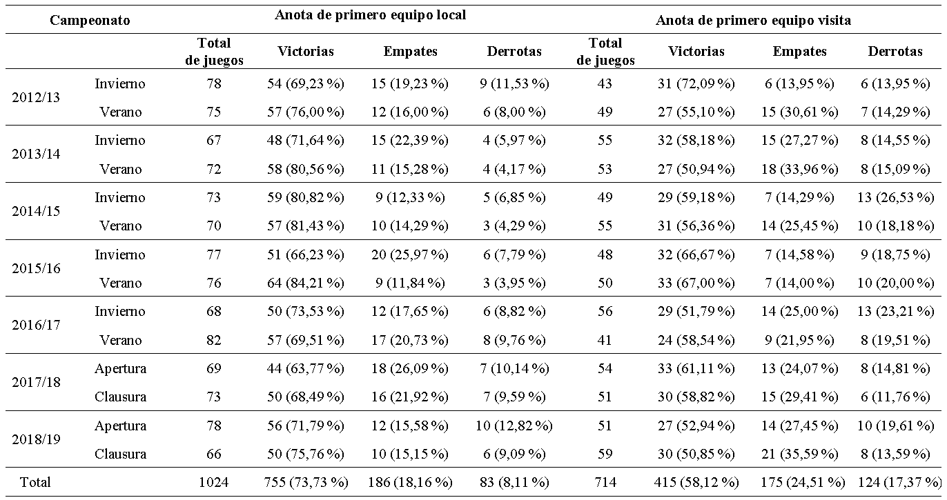 Jugar en casa representó una ventaja del 62,46 % para que los equipos lograran resultados positivos. Este porcentaje se encuentra en concordancia con lo reportado en otras ligas alrededor del mundo. El hecho de anotar de primero en el partido incrementa las posibilidades de ganar y, si se logra jugando en casa, las probabilidades de dicho gane son mayores.
