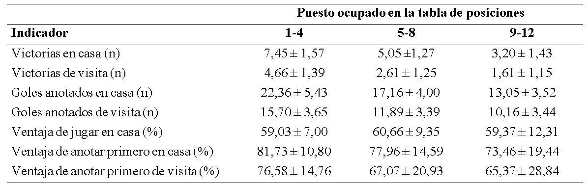 Al comparar la ventaja de jugar en casa (H = 1,20; p = 0,53; ε2 = 0,00) y la de anotar primero para equipos locales (H = 3,72; p = 0,15; ε2 = 0,04), según la posición ocupada en la tabla de posiciones del campeonato, no se evidenciaron diferencias significativas (tabla 4). No obstante, sí se encontró que la ventaja de anotar primero para equipos visitantes (H = 6,97; p = 0,03; ε2 = 0,04) fue significativamente mayor para aquellos en posiciones 1-4 -respecto a las otras posiciones- (tabla 4). Los equipos que ocuparon las 4 primeras posiciones ganaron significativamente más partidos en casa (H = 102,50; p < 0,001; ε2 = 0,61) y de visita (H = 74,84; p < 0,01; ε2 = 0,51); igualmente, anotaban, en promedio, mayor cantidad de goles tanto en condición de locales (H = 85,91; p < 0,01; ε2 = 0,44) como de visitantes (H = 51,03; p < 0,01; ε2 = 0,51) en comparación con los equipos que se colocaron en las posiciones de la 5 a la 8 y de la 9 a la 12.
