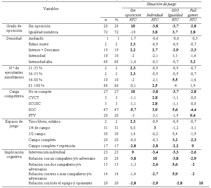 Los resultados descriptivos y los RTC de las variables cualitativas primarias de carga externa, se muestran en la tabla 2. El entrenador analizado diseña principalmente, tareas de entrenamiento de igualdad numérica (72 %). Respecto a la densidad, elabora en numerosas ocasiones tareas de intensidad alta (68 %), y las tareas andando (1 %) son escasas.