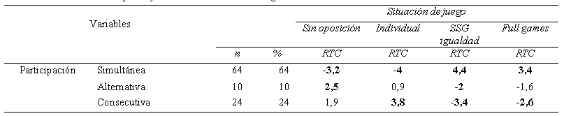 El entrenador analizado, utiliza una participación alternativa, en situaciones individuales usa una participación consecutiva y en situaciones tanto de SSG de igualdad como de Full Games, utiliza una participación simultánea. La participación simultánea de los jugadores es más frecuente en entrenadores próximos a una metodología alternativa o comprensiva (Ibáñez et al., 2015).