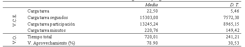 Variables organizativas: tiempo total de la tarea, tiempo de explicación, tiempo útil, aprovechamiento, participación y valor de la participación.