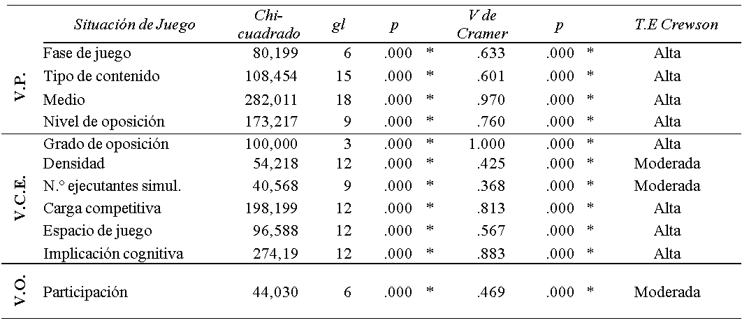 En primer lugar, se realizó un análisis descriptivo para obtener información sobre cada una de las variables del estudio; posteriormente, y con el fin de identificar las relaciones entre las SJ con respecto a las variables cualitativas pedagógicas, variables de carga externa y variables organizativas que influyen en el diseño de las tareas de entrenamiento, se empleó Chi cuadrado (χ2), y V Crammer (Newell et al., 2014).