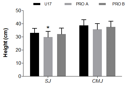 Figure 1 represents the height (cm) obtained for all groups in the SJ and CMJ test. A significant difference (F(2,61)= 3.64, p= .032) was observed for SJ between U-17 (33.02±3.37 cm) and PRO A (29,81±4.38 cm). However, no significant differences (F(2,61)= 1.89, p= .160) were noticed in CMJ for any groups.
