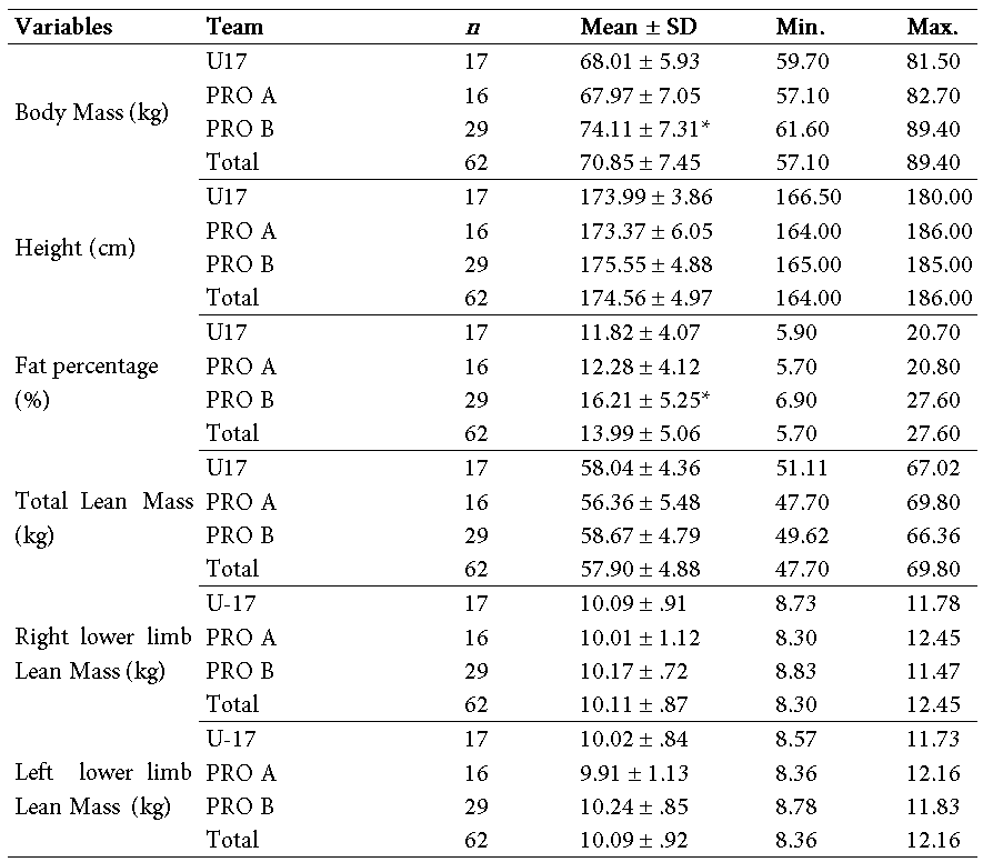 Table 1 shows the body composition values for all groups. There were no significant differences in TMM, RHM, and LHM between three groups. Nonetheless, the results showed a significant difference in body mass (F(2,61)= 6.07, p= .004) and fat % (F(2,61)= 6.14, p= .004) in favor to PRO A compared to U-17 and PRO B (Pro B with the highest value).