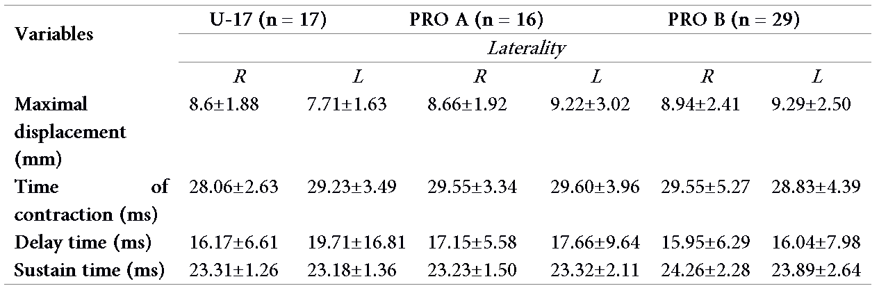 Table 2 shows the TMG values for all groups. There were no significant differences in Dm, Tc, Td or Ts between any groups in function of laterality and category (DmRRF (F(2,61)= .144, p= .866); DmLRF (F(2,61)= 2.470, p= .093); TcRRF (F(2,61)= .763, p= .471); TcLFR (F(2,61)= .188, p= .829); TdRRF (F(2,61)= .199, p= .820) TdLFR (F(2,61)= .554, p= .578); TsRRF (F(2,61)= 2.171, p= .123); TsLRF (F(2,61)= .663, p= .519).
