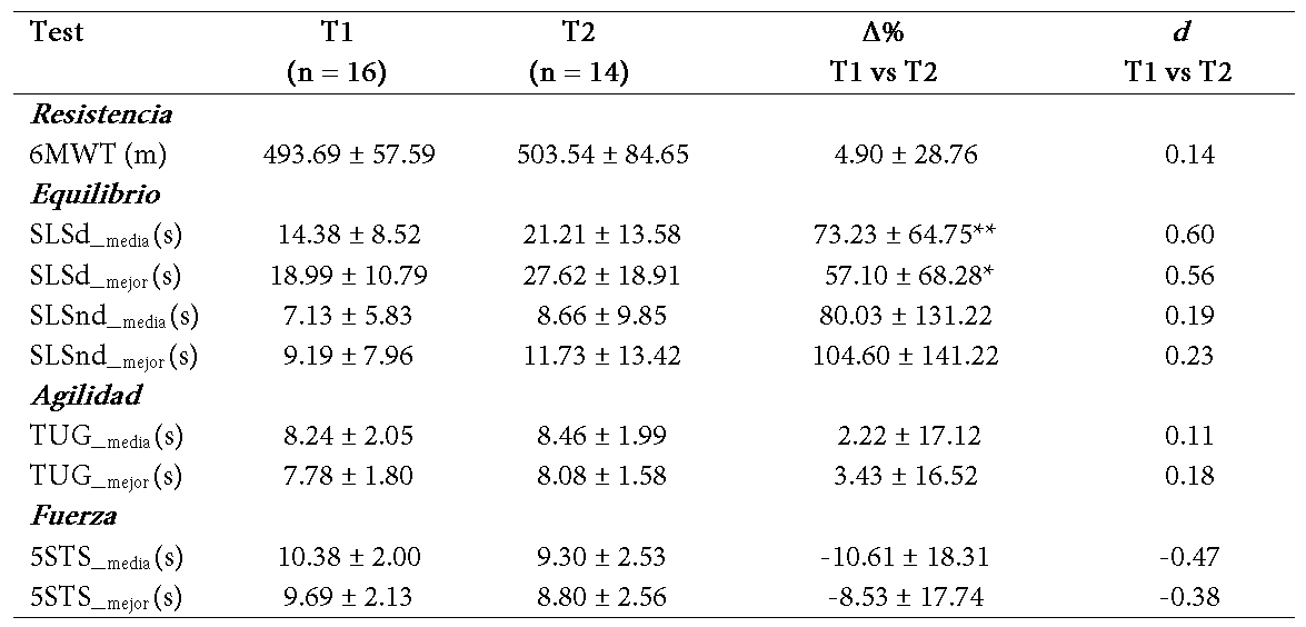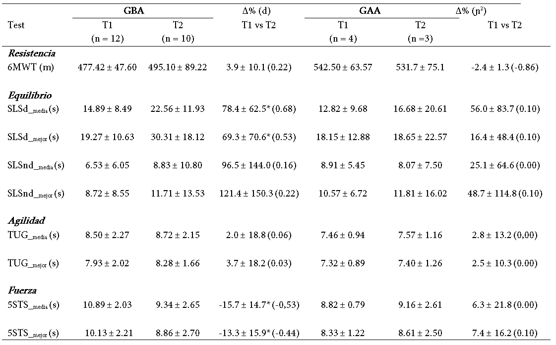 En la Tabla 3 se presentan los efectos de cada grupo (GBA y GAA). En el grupo GBA se observaron mejoras significativas en SLSd_media, SLSd_mejor 5STS_media y 5STS_mejor (d = 0.44 – 0.68, p < 0.05). Sin embargo, no hubo diferencias significativas en 6MWT, SLSnd, y TUG. En el grupo GAA no se observaron diferencias significativas en ningún test funcional.