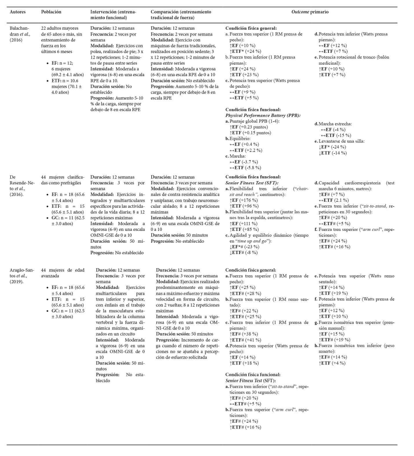 EF = Entrenamiento Funcional, ETF = Entrenamiento Tradicional de Fuerza, GC = Grupo control. 1 RM = 1 repetición máxima, RPE = Escala de percepción del esfuerzo percibido 1-10 “Rating of Perceived Exertion”, OMNI-GSE = Escala de percepción de esfuerzo de 1-10 “OMNI-Global Session in the Elderly”, ↑ = Aumento significativo (p<0.05) en comparación a la condición preentrenamiento, ↓ = Disminución significativa (p<0.05) en comparación a la condición preentrenamiento, ↔ = Sin cambios significativos en comparación a la condición preentrenamiento, * = Diferencias significativas entre grupos de entrenamiento, # = Diferencias significativas en comparación a GC.El objetivo del presente estudio fue evaluar la efectividad del EF en comparación con el ETF, sobre el mejoramiento de la condición física en los adultos mayores. Entre los elementos de la condición física general, mayormente abordados, se encuentra la fuerza, la cual fue estudiada en cuatro de los artículos incluidos y clasificada de la siguiente manera: a) fuerza del tren superior e inferior; b) fuerza dinámica máxima; c) fuerza isométrica; d) fuerza de los flexores de tronco; y e) fuerza de los extensores del tronco (Aragão-Santos et al., 2019; Balachandran et al., 2016; Da Silva-Grigoletto et al., 2019; De Resende-Neto et al., 2018, 2019). En el estudio de Aragão-Santos et al. (2019), la fuerza fue dividida en dos aspectos: fuerza dinámica máxima y fuerza isométrica. Ambas manifestaciones de la fuerza presentaron mejoras respecto a la condición preentrenamiento, tanto en respuesta al EF como el ETF, sin identificarse diferencias significativas entre ambos grupos. Interesantemente, se observaron diferencias significativas específicas respecto al grupo control para cada grupo experimental. Específicamente, el ETF mostró mayores niveles de fuerza máxima (28 % vs. 25 %) y fuerza isométrica para el tren superior (19 % vs. 15 %), mientras que el EF manifestó mayores niveles de fuerza isométrica del tren inferior (14 % vs. 4 %). Lo anterior sugiere que la modalidad de EF empleada en el estudio de Aragão-Santos et al. (2019) puede tener un mayor efecto sobre manifestaciones de la funcionalidad relacionadas a la locomoción. Por otra parte, De Resende-Neto et al. (2018), evalúo la fuerza del tren superior e inferior. Al respecto, los participantes aumentaron significativamente su fuerza en prensa de pecho (EF = 7 %; ETF = 10 %), remo sentado (EF = 7 %; ETF = 8 %) y de sentadilla (EF = 14 %; ETF = 16 %) respecto a la condición preentrenamiento; sin detectarse diferencias entre ambos grupos.