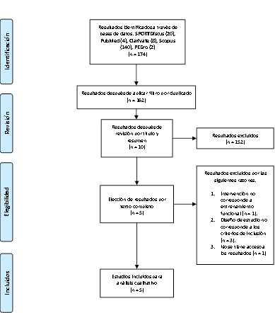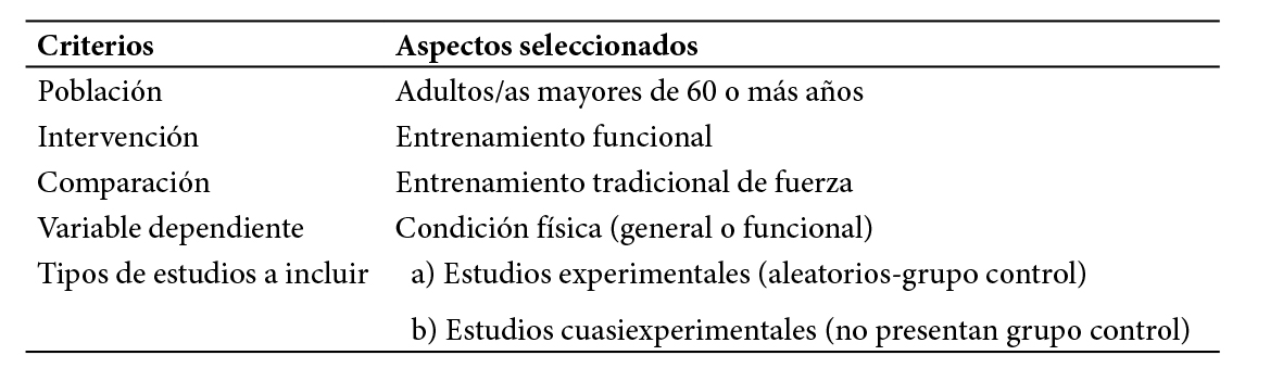 Fuente: Elaboración propia.Los criterios de inclusión, de forma más detallada, fueron los siguientes seis: a) estudios con adultos/as mayores de 60 o más años; b) la población podía ser saludable o presentar ECNT asociadas a la vejez (diabetes, cáncer, enfermedades coronarias, Alzheimer o Parkinson) u otras como fragilidad, sarcopenia, dinapenia y osteopenia; c) estudios con intervenciones de entrenamiento funcional con cuatro o más semanas; d) estudios con intervenciones de fuerza con sobrecarga con cuatro o más semanas; e) estudios con elementos tradicionales de condición física o cualidades físicas (fuerza, flexibilidad, resistencia, agilidad, velocidad, etc.) y pruebas de condición física funcional para el AM (ej.: Senior Fitness Test, test de marcha, etc.); f) estudios experimentales y cuasiexperimentales.