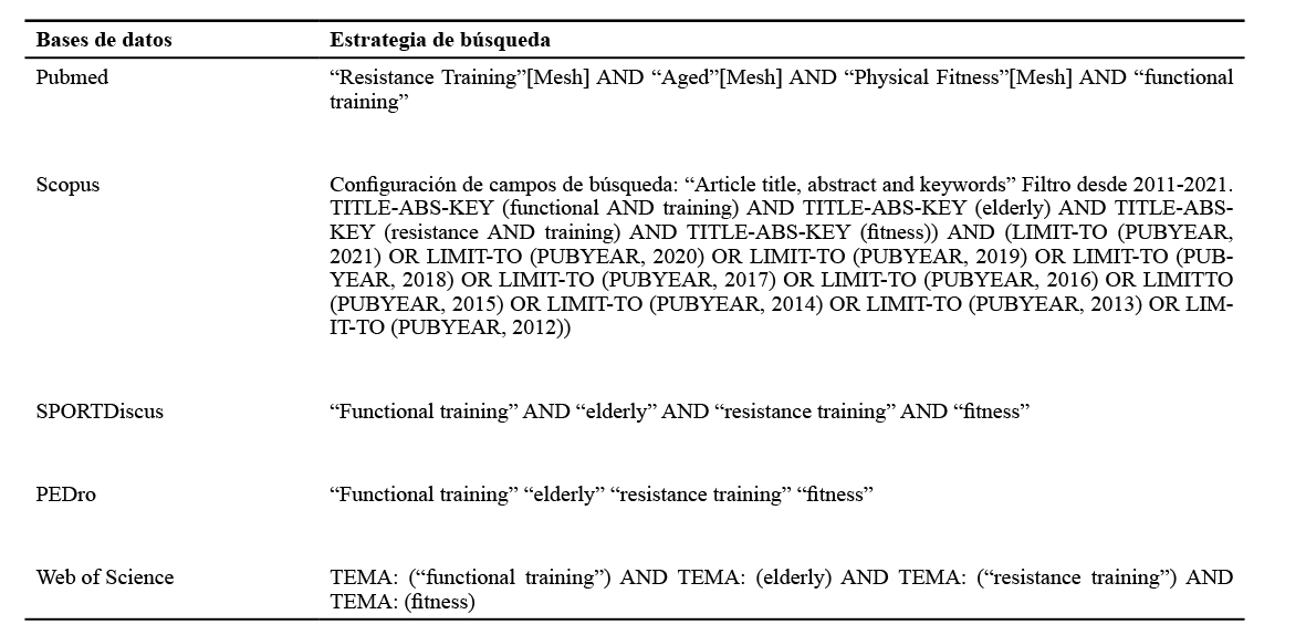Fuente: Elaboración propia.Para la selección de artículos, se consultaron las siguientes bases de datos: Pubmed, SCOPUS, SPORTDiscus, PEDro y Web of Science. La estrategia de búsqueda incluyó términos clave como “functional training”, “elderly”, “resistance training” y “fitness”. Cabe destacar, que para cada base de datos consultada se diseñó una estrategia de búsqueda específica, como se aprecia en la Tabla 2. Además, esta búsqueda se desarrolló entre el 31 de mayo y el 4 de junio de 2021.