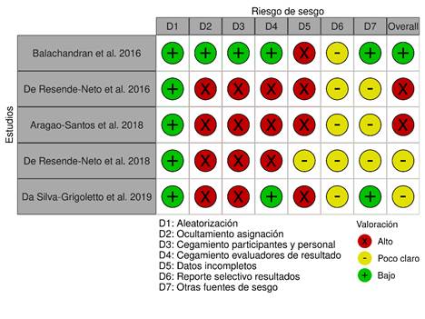 Fuente: Elaboración propia.Una vez seleccionados los artículos, se realizó un análisis de riesgo de sesgo (Figura 2). Al respecto, se observó que todos los trabajos incluidos presentaron un bajo riesgo de sesgo en los indicadores de aleatorización y otras fuentes de sesgo. Solo uno de los artículos (Balachandran et al., 2016) presentó un bajo riesgo de sesgo en los dominios de ocultamiento de la asignación y cegamiento de participantes y personal. Por otra parte, cuatro de los estudios (Aragão-Santos et al., 2019; Balachandran et al., 2016; Da Silva-Grigoletto et al., 2019; De Resende-Neto et al., 2016) presentaron un alto riesgo de sesgo en el indicador de datos incompletos, mientras que el trabajo restante (De Resende-Neto et al., 2018) presentó un riesgo de sesgo poco claro en este indicador. En relación con el indicador de reporte selectivo de datos, todos los trabajos incluidos mostraron un riesgo de sesgo poco claro. Tres de los trabajos analizados no detallaron la progresión de cargas aplicadas en alguna de las intervenciones (Aragão-Santos et al., 2018; De Resende-Neto et al., 2016, 2018), valorándose otras fuentes de sesgo con un riesgo poco claro. Finalmente, todos los artículos incluidos presentaron aprobación bioética de los procedimientos experimentales.
