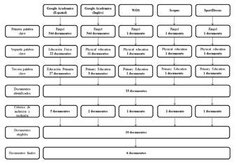 Para la búsqueda de los documentos, se utilizaron las siguientes bases de datos: Web of Science (en adelante, WOS), Google Académico (en adelante, GA), SportDiscus y Scopus. Para ello, se utilizaron las palabras clave: “Ringol”, “Physical education”, y “Primary education” en el idioma inglés, y, “Ringol”, “Educación física” y “Educación primaria” en el idioma español. Tras introducir el primero de los términos, se identificó un número total 1091 documentos, los cuáles fueron reduciéndose, a medida que se introducían el resto de los términos clave, seleccionados. Finalmente, hasta el mes de noviembre de 2022, se obtuvo un total de 6 documentos válidos, que cumplían los criterios de inclusión y exclusión de manuscritos relacionados con el Ringol. En la Figura 1, se muestra el procedimiento de búsqueda realizado, tras el cual, se obtuvo un número final de 6 manuscritos.