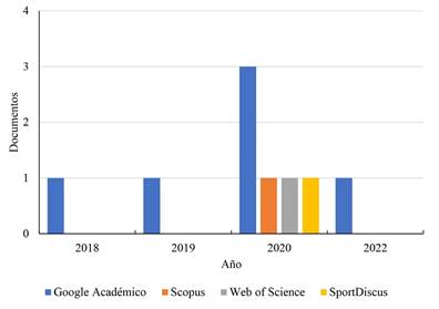 En la Figura 3, se muestra la evolución de los manuscritos seleccionados, en función del año de publicación, así como la base de datos en la cual se han identificado.