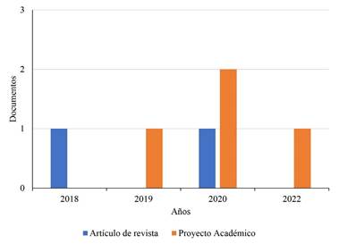 En la Figura 4, se muestra el Tipo de documento encontrado en relación con el año de publicación. La muestra está compuesta únicamente por proyectos académicos (n=4) y, artículos de revista (n=2). Además, es el año 2020 en el cual se han publicado mayor número de estudios.