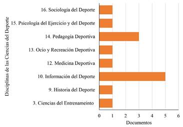 En la Figura 5, se muestra el número de documentos en función de las disciplinas de las Ciencias del Deporte (Borms, 2008). Se observa como la Información del deporte es la más repetida (n=5), seguida de la Pedagogía deportiva (n=3).