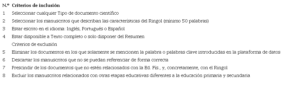 Metodología: Para ello, se llevó a cabo una búsqueda de documentos en las siguientes bases de datos: Google Académico, Web of Science, Scopus y Sportdiscus. Para la búsqueda de los documentos, se han utilizado las siguientes palabras clave: “Ringol”, “Physical education”, y “Primary education”, obteniendo un número final de 6 documentos válidos, identificados hasta el mes de noviembre de 2022. Para limitar la búsqueda y conseguir los documentos más adecuados, se establecieron una serie de criterios de inclusión y exclusión elaborados por los investigadores.