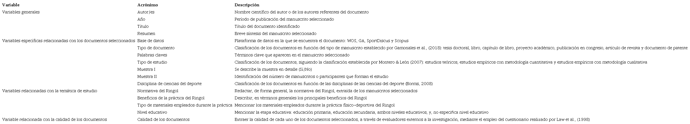 Los manuscritos seleccionados para llevar a cabo la revisión sistemática fueron clasificados atendiendo a una serie de variables (Tabla 2): variables generales, variables específicas de los documentos seleccionados, variables relacionadas con la temática de estudio, y, variable relacionada con la calidad de los documentos seleccionados.