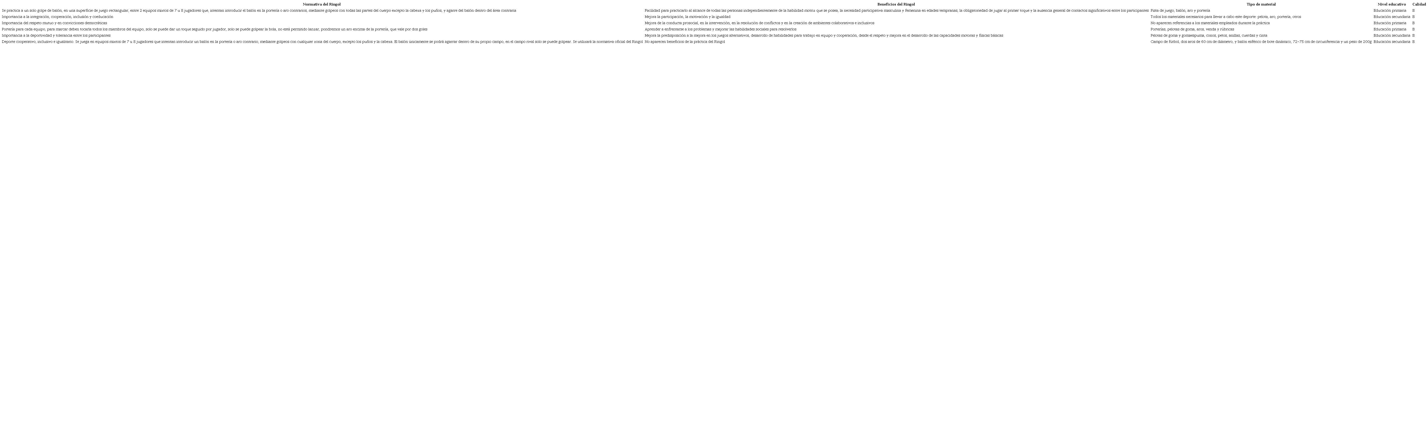 Conclusões: Os documentos analisados mostram que os principais benefícios do Ringol são a prática igualitária, o desenvolvimento de habilidades motoras e ações como participação, motivação, cooperação e respeito. O nível educativo onde esses projetos são realizados é tanto na Educação Primária quanto na Educação Secundária. Por fim, esta revisão serve como base e guia para pesquisas futuras sobre o Ringol.