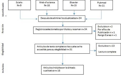 Materiales y métodos: se diseñó una investigación orientada con base en metodología PRISMA. La búsqueda de la información se desarrolló en cuatro bases de datos WOS, PUBMED, SCIELO y ELSEIVER entre los años 2015 al 2020.