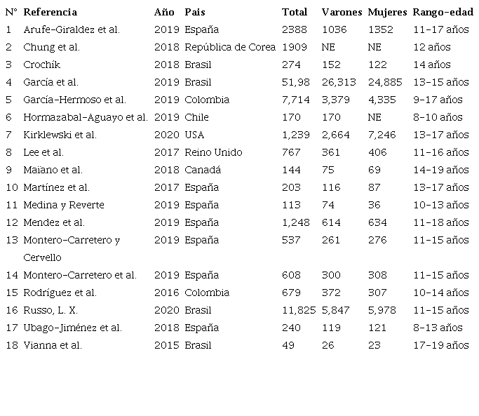 Se observa que la mayoría de las investigaciones han sido realizados en adolescentes, excepto dos que han puesto su acento en niños. El tamaño de la muestra fue muy variado, oscilando desde 49 hasta 51.198 sujetos. Todos los estudios han considerado ambos sexos.
