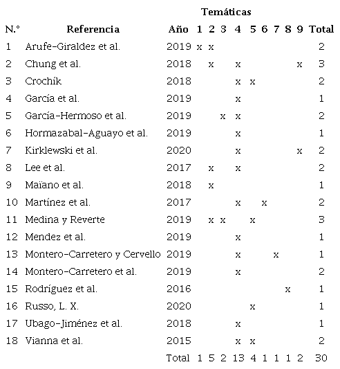En la tabla 2, representa las nueve temáticas consideradas dentro del AE. De ellas 13 estudios abordan el bullying; cinco trabajos representan la victimización; cuatro in vestigaciones exponen la violencia escolar; la autoestima se ve representada en dos textos y el resto de las materias en un solo artículo.