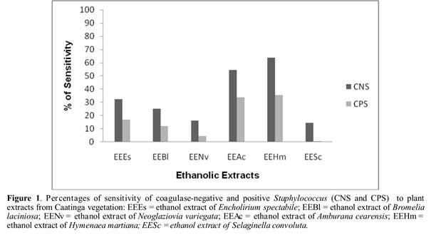 The fact that there was a greater percentage of sensitivity of the CNS to all extracts is a significant result since the phenomenon of resistance has been observed for different antimicrobial drugs in many isolates of CNS (TAPONEN; PYÖRÄLÄ, 2009).
