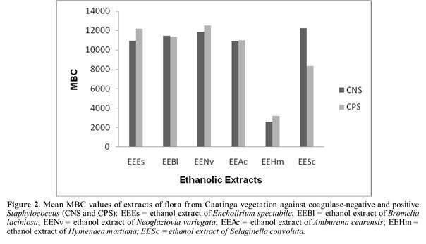Six types of ethanolic extracts were used: EEEs = ethanolic extract of Encholirium spectabile; EEBl = ethanolic extract of Bromelia laciniosa; EENv = ethanolic extract of Neoglaziovia variegate; EEAc = ethanolic extract of Amburana cearensis; EEHm = ethanolic extract of Hymenaea martiana, and EESc = ethanolic extract of Selaginella convoluta. Each bacterial isolate was considered as unit and the tests were performed in triplicate. The mean MBC value obtained from each bacterial isolate was considered as the response variable. Antimicrobial activity that exhibited a P value of less than 5% (P < 0.05) according to the null hypothesis was subjected to the Kruskal-Wallis test, followed by Dunn's test to compare the median MBC values using software BioEstat 5.3.