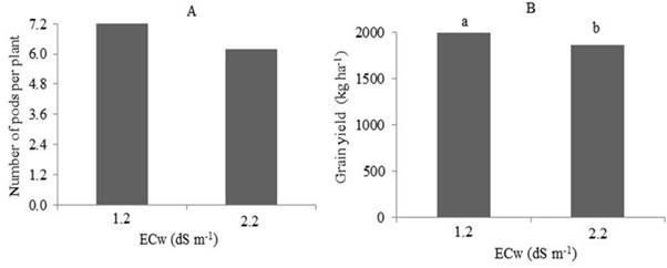 The highest NP (Figure 1A) and GY (Figure 1B) were found with ECw of 1.2 dS m-1. Plants at this soil salinity showed average values of 7.02 pods per plant, and 6.21 at 3.3 dS m-1 (Figure 1A). Thus, increasing the water salinity (1.2 to 3.3 dS m-1) resulted in a loss in NP of 11.5%. GY (Figure 1B) was 2,000 kg ha-1 at 1.2 dS m-1 and 1,860 kg ha-1 at 3.3 dS m-1, a yield loss of 7% due to the higher water salinity.