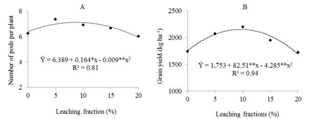 The leaching fractions that presented the highest NGP (9.19%) and GDW (9.82%) were similar to the one that had the highest GY (9.6%) (Figure 2B), confirming the results of other studies (CARDOSO, MELO, LIMA, 2005; ASSIS JÚNIOR et al., 2007) that found positive correlation between these production components and the V. unguiculata GY.