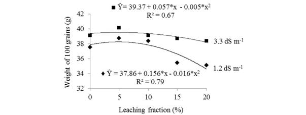 The production component 100GW had lower values in the extreme leaching fractions and higher values in the intermediate leaching fractions (Figure 3), similarly to the NP (Figure 2A) and GY (Figure 2B), with two simultaneous and adverse effects probably due to nutritional imbalance: the salt leaching from the soil (deficiency), which was more pronounced in plants irrigated with water salinity of 1.2dS m-1; and the effect of excess of salts.
