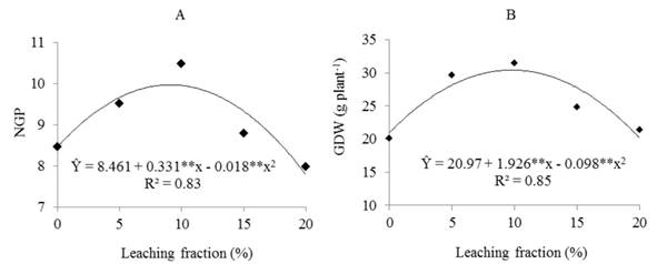 The leaching fractions had positive action on the NGP (Figure 4A) and GDW (Figure 4B). The greatest NGP estimated by the regression model was 10, with a leaching fraction of 9.19% (Figure 4A) and the greatest estimated GDW was 30 g, with a leaching fraction of 9.82% (Figure 4B). The extreme leaching fractions had the lowest values for both variables, probably due to the two simultaneous and adverse effects of nutritional imbalance (leaching fractions greater than 9.19% for NGP and 9.82% for GDW) and the effect of excess of salts (leaching fractions lower than 9.19% for NGP and 9.82% for GDW).