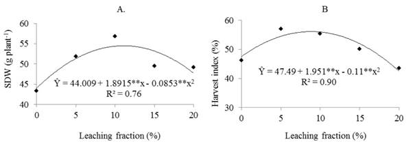 The regression equation model that best fitted the SDW and HI data was the quadratic (Figures 5A and 5B), showing lower values for the extreme leaching fractions, similarly to the results on the effects of leaching fractions for all variables above (Figures 2, 3 and 4), probably due to the nutritional imbalance caused by the effect of the leaching of salts from the soil profile (leaching fractions greater than 11.09 for SDW and 8.9% for HI) and the effect of excess of salts (less than 11.09 for SDW and less than 8.9% for HI).
