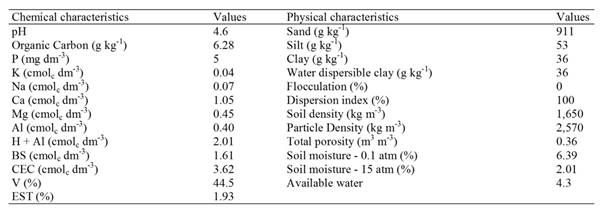 The soil used for filling the lysimeters was collected from the 0-20 cm layer of a sandy Entisol (SiBCS, 2006). The chemical, physical and hydraulic characteristics of the soil were evaluated (Table 1) according to methodologies of the Embrapa (2011).