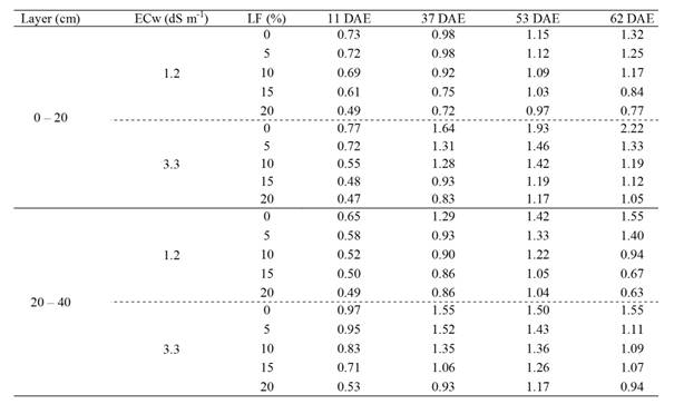 The leaching fractions caused progressive reductions in the soil salinity levels throughout the experiment (Table 2), despite the increased salt concentrations in both soil layers caused by irrigation with saline water, indicating that it is an alternative to control the gradual increase of salts in the root zone (ASSIS JÚNIOR, 2007; SILVA et al., 2011), and contribute to the tolerance to problems caused by salinity in irrigated agriculture (RITZEMA et al., 2008; BEZERRA et al., 2010), especially in places where the precipitation and the availability of good quality water for irrigation is scarce.