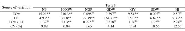 The interaction between water salinity and leaching fractions had no significant effect on the variables evaluated, except for the 100-grain weight (100GW) (Table 3). The water salinity levels and leaching fractions influenced NP, GY and 100GW. The leachings fractions influenced NGP, GDW, SDW and HI.