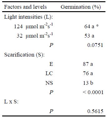 For each combination of levels of factors (scarification and light intensity) were settled five replicates with ten scarified fruits or seeds per replicate. A total of 300 scarified fruits were placed on sterile agrolite, germinative capacity was the study variable and was recorded along 75 days.