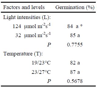For this assay, were used seeds with embryo and cotyledons exposed (E). For each combination of levels of factors (light intensity and temperature regimes) were used five replicates with ten seeds per replicate. A total of 200 seeds were placed on sterile agrolite, germinative capacity was the study variable. The seeds were considered to be germinated when the radicle reached the length of the seed (approximately 1 cm). Germinative capacity was recorded for 55 days.
