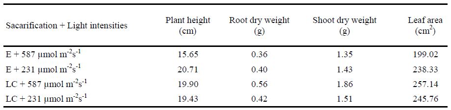 The best (lowest) slenderness coefficient was reached with a light intensity level of 587 µmol m-2s-1 (Figure 4 c ). On the other hand, a light intensity level of 231 µmol m-2s-1 yielded the highest leaf area (Figure 4 d ).