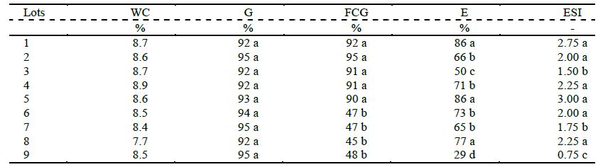 There was no significant difference in germination between lots in the present study. However, there was significant difference in seedling emergence between lots. This was probably due to the conditions under which the tests were carried out. The germination test was performed under controlled temperature and humidity, while the emergence test was carried out under field conditions.