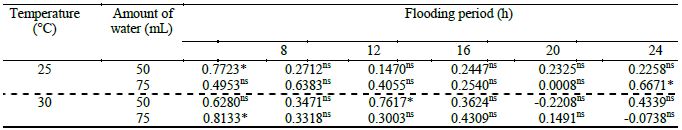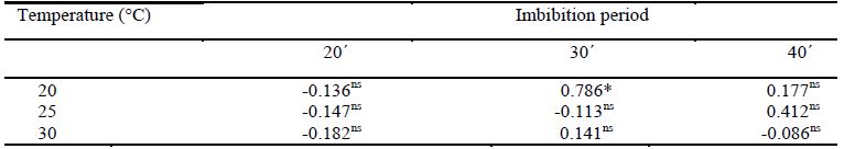 Table 4 shows the correlation between the flooding test result and seedling emergence. Of the various combinations assessed in the present study, seeds immersed in 50 mL of distilled water at 25 °C for 4 h, 75 mL of distilled water at 30 °C for 4 h, and 50 mL of distilled water at 30 °C for 12 h exhibited significant correlation with the seedling emergence. During the flooding period, the availability of oxygen is reduced and a large quantity of water quickly enters the seed due to the difference in the water potential between the seed interior and the environment. This induces fermentative metabolism and injures the seed by imbibition (COSTA et al., 2008a; COSTA et al., 2008b). The seed with some kind of injury has less energy for germination; such seeds will be negatively affected by the flooding process water, thus lowering the vigor (CUSTÓDIO et al., 2009).