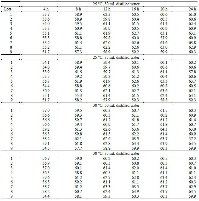 The water content of soybean seeds after the flooding test is shown in Table 3. Lot 9 had the lowest water content both at 25 and 30 °C after 4 h of immersion. Even after 24 h of immersion in distilled water, the seeds of lot 9 continued to have the lowest water content.