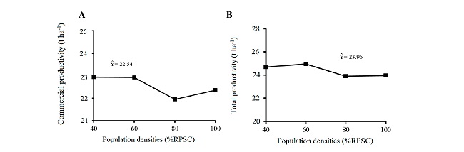 It was not possible to adjust a response equation for commercial and total carrot root productivity as a function of population density of cowpea (Figures 1A, 1B). LIMA et al. (2013) state that as spacing decreases and population density increases, within certain limits, there is an increase in total production per area, resulting in greater profitability for the producer.