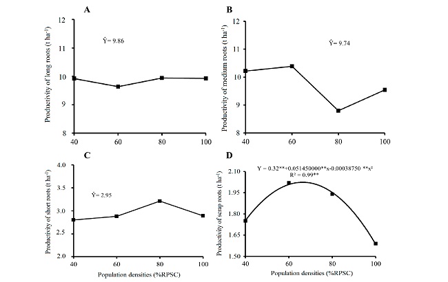 It was not possible to adjust a response equation for the long, medium, and short root productivity as a function of population density of cowpea (Figures 2A, 2B, and 2C). This behavior was also observed in these characteristics by Oliveira et al. (2011), who evaluated the agronomic performance of the carrot fertilized with hairy woodrose before sowing.