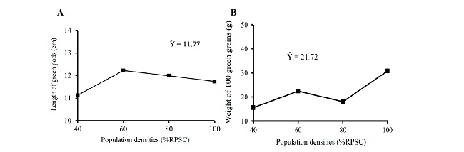 It was not possible to adjust a response equation for length of green pods and weight of 100 green grains of cowpea as a function of population density of cowpea (Figures 3A and 3B).