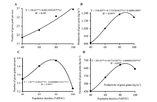 However, when cowpea variables were analyzed as a function of population density, response equations for number of green pods per area, productivity of green pods, number of green grains per pod and productivity of green grains were found (Figures 4A, 4B, 4C, and 4D).