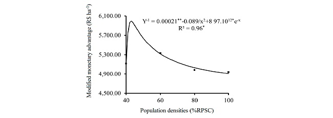It was possible to adjust the response equation 5,996.84 per hectare at a cowpea density of 42% of for modified monetary advantage as a function of the RPSC, with a decrease in its value with an population density of cowpea (Figure 5). An increase increase in cowpea population density. was observed, reaching a maximum value of R$ 5,996.84 per hectare at a cowpea density of 42% of the RPSC, with a decrease in its value with an increase in cowpea population density.