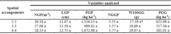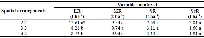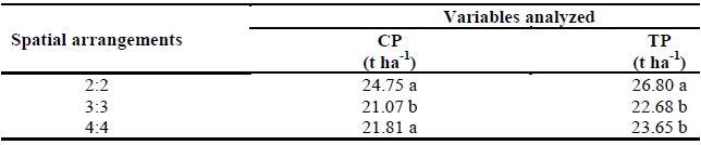 Similarly, no significant differences were observed between spatial arrangements (2:2, 3:3, and 4:4) in these analyzed variables (Table 3). This means that the use of environmental resources for spatial arrangements and the development and production of these variables was similar, to the point of not promoting differentiation between them.
